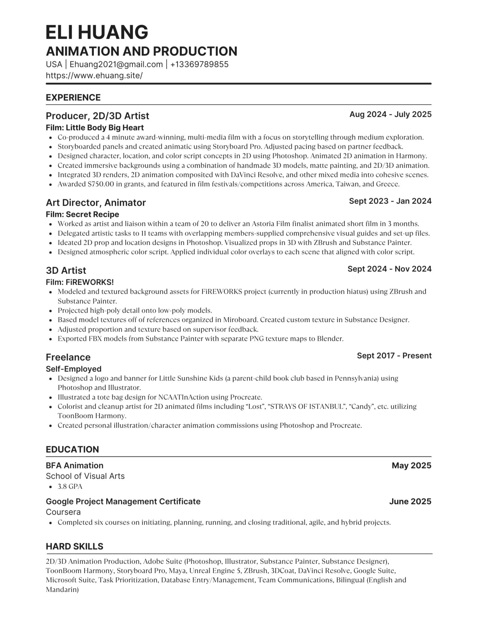 Thank you for taking a look at my page. ^ w ^I'm a multi-media artist and animator who recently graduated May 2025 with my BFA in Animation from the School of Visual Arts.I'm passionate about storytelling and entertainment, and am constantly falling in love with how the world tells their craft in moving-picture forms. People and community are the center of my world, and it's what keeps me (and my work) curious and inspired.In my free time you'll find me chasing after my runaway dog, walking lakeside trails, and playing multi-player video games with my friends.I'd love to work with you and your project! Shoot me an email at:[email protected]